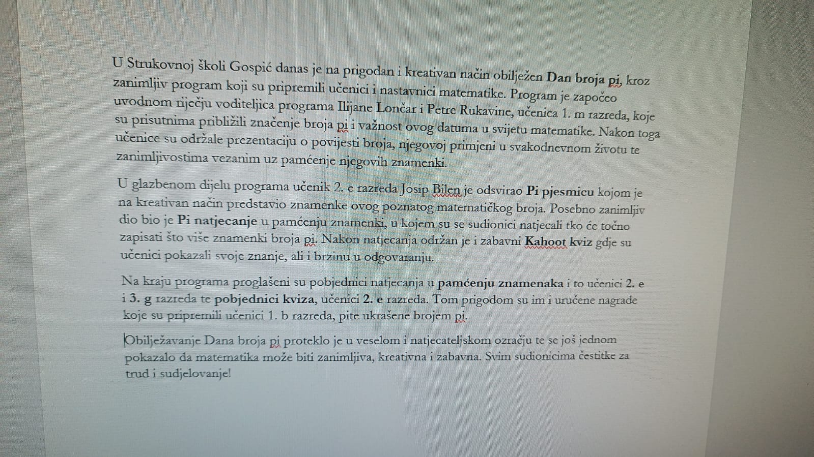 Posebno zanimljiv dio bio je Pi natjecanje u pamćenju znamenki, u kojem su se sudionici natjecali tko će točno zapisati što više znamenki broja pi. Nakon natjecanja održan je i zabavni Kahoot kviz gdje su učenici pokazali svoje znanje, ali i brzinu u odgovaranju.